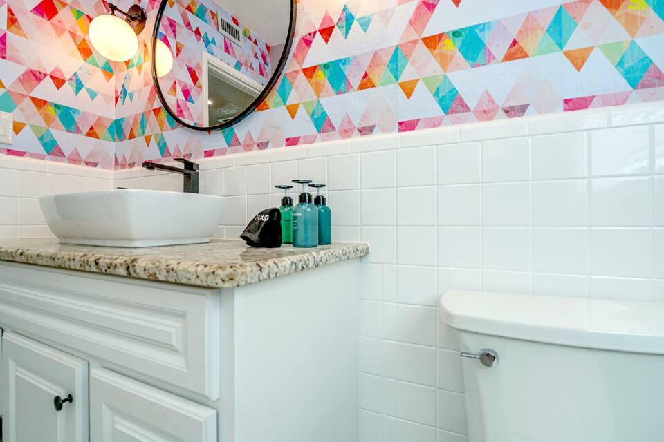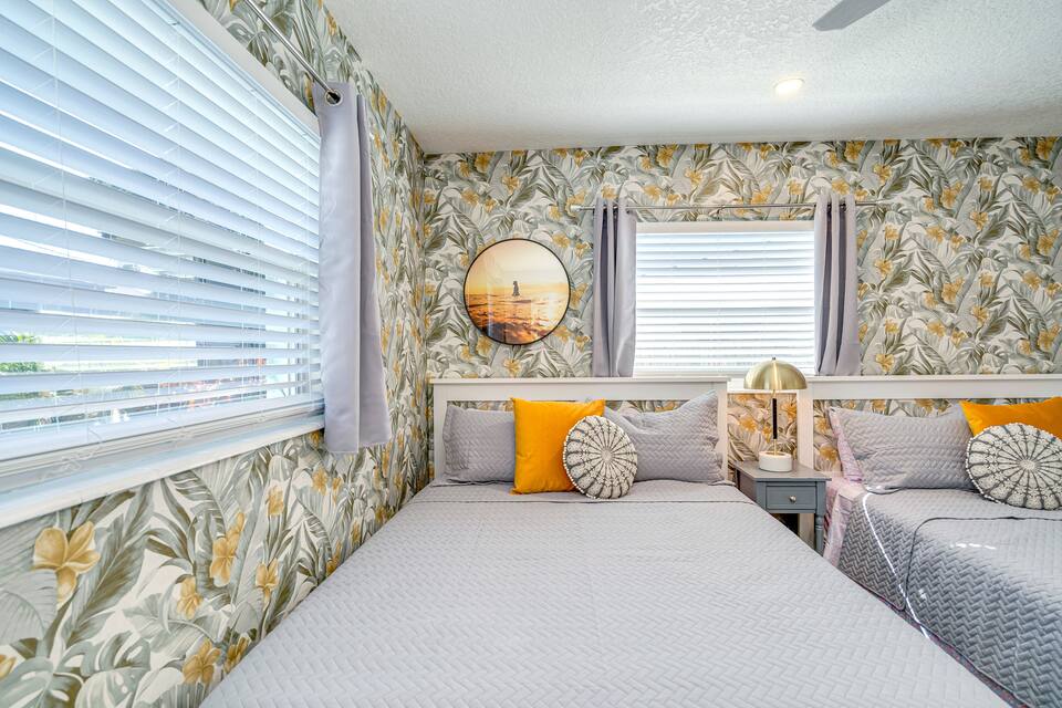 This home SLEEPS 14 GUESTS and is nestled in a delightful beach neighborhood just a block from the cutest neighborhood ice-cream shop! The open-concept of this spacious home features fantastic retro decor. Every detail, from the stylish lighting to the vibrant accents, creates a warm “welcome to the beach” vibe.