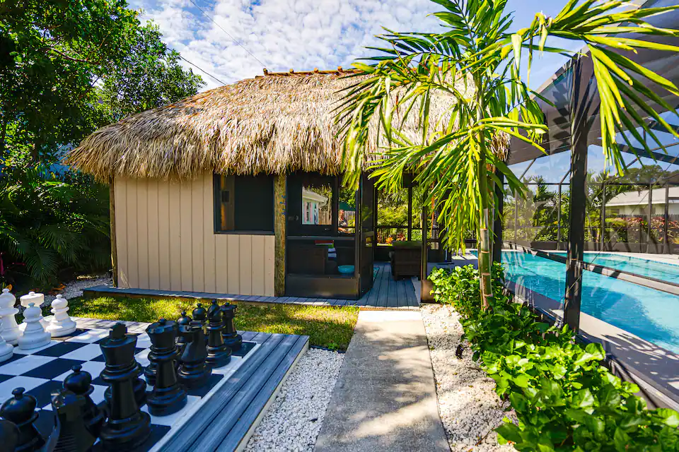 Welcome to your ultimate group getaway! This unique home brings the fun with a MASSIVE pool, pool bar, oversized outdoor chess, and a huge screened-in tiki hut (optional HEATED POOL). The home is stunning but don’t forget about the stylish guest cottage (with kitchenette + full bath) it is perfect for the guest of honor or bachelorette. Big vibes, tons of space, and unforgettable memories—this is not your average vacation rental.