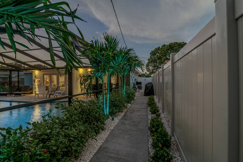Fire up the propane grill for delicious, alfresco meals and challenge your companions to a game of life-size chess for some friendly competition. The colorful tropical vegetation enhances the backyard’s charm and as the sun sets, the colorful landscape lighting makes for perfect evening ambiance.