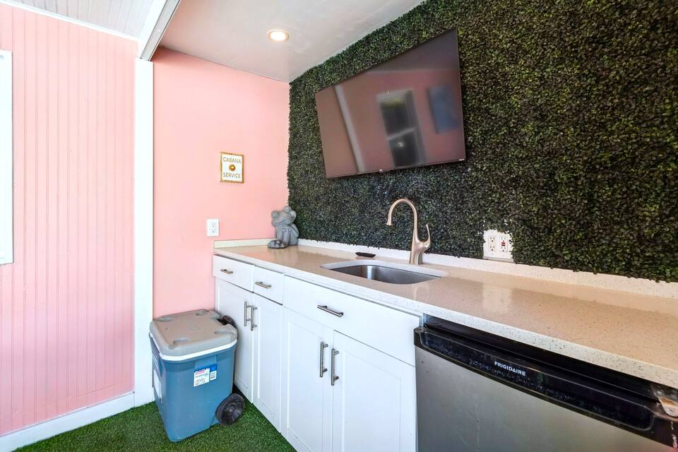 5 bedroom + 3 bath home sleeps 16 and is just six minutes to the beaches! Home has an adorable pink poolside guest bungalow and colorful decor that exudes vacation vibes— the resort style backyard is better than incredible! There are TWO poolside cabanas, a custom fire pit, chessboard and a HUGE 7-hole putting green. Nestled in a lovely neighborhood near dining, shopping, coffee shops and beaches! Heated pool OPTION available for an additional cost