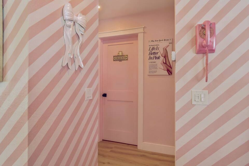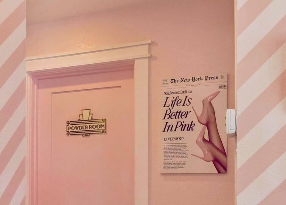 Four uniquely curated PINK bedrooms that comfortably sleep 16 guests, each filled with exquisite statement furniture that’s perfect for photos, lounging, or just feeling like you’ve stepped into a PINk wonderland. The PINk glam Station is a head-turning space for hair, makeup, and pre-night-out magic.