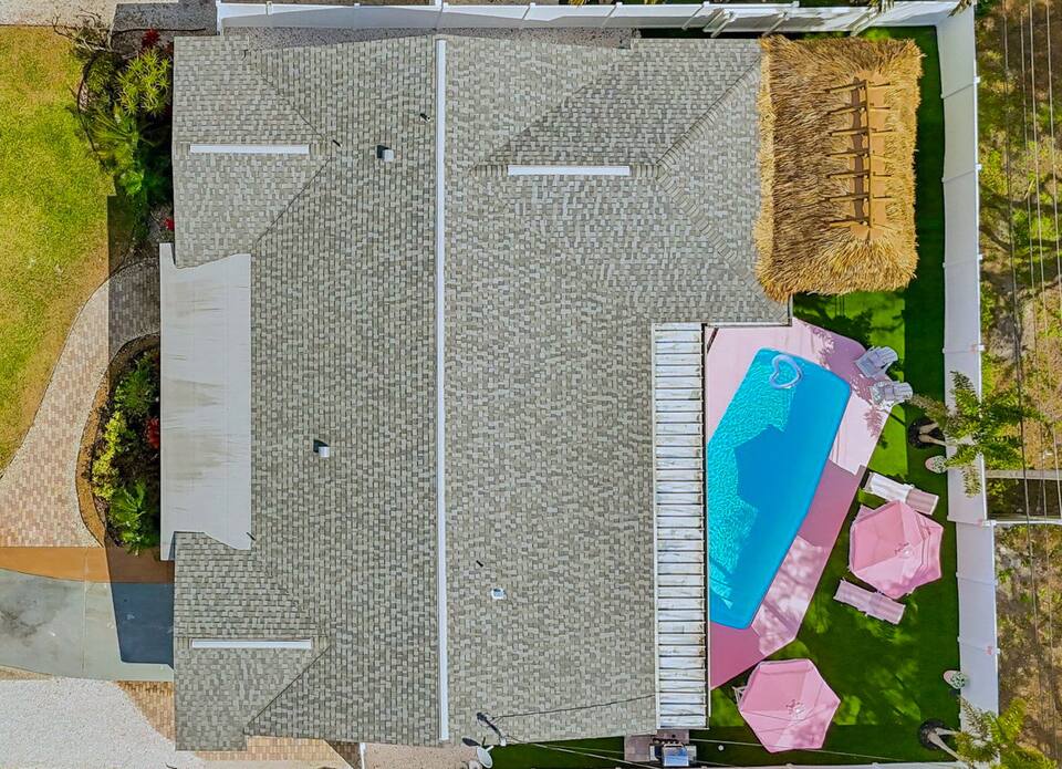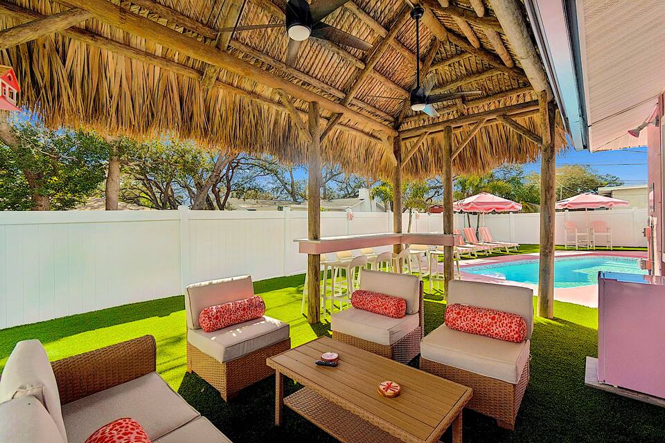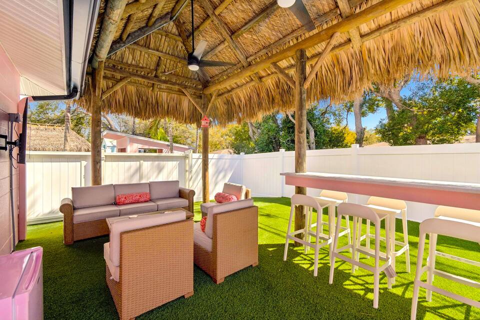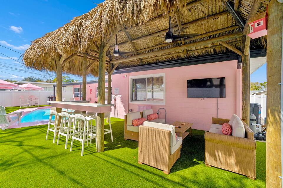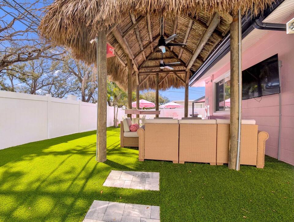 Step outside to Florida outdoor living: a massive covered tiki hut with plush lounge seating and outdoor TV, all set against lush green turf that really sets the pink aglow. At night, the property comes alive with next-level pink and white landscape lighting, creating a glowing, unforgettable dreamscape.